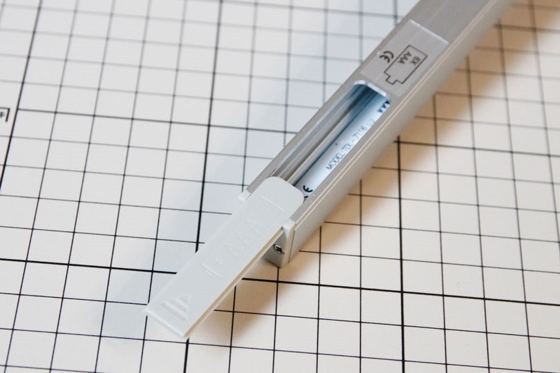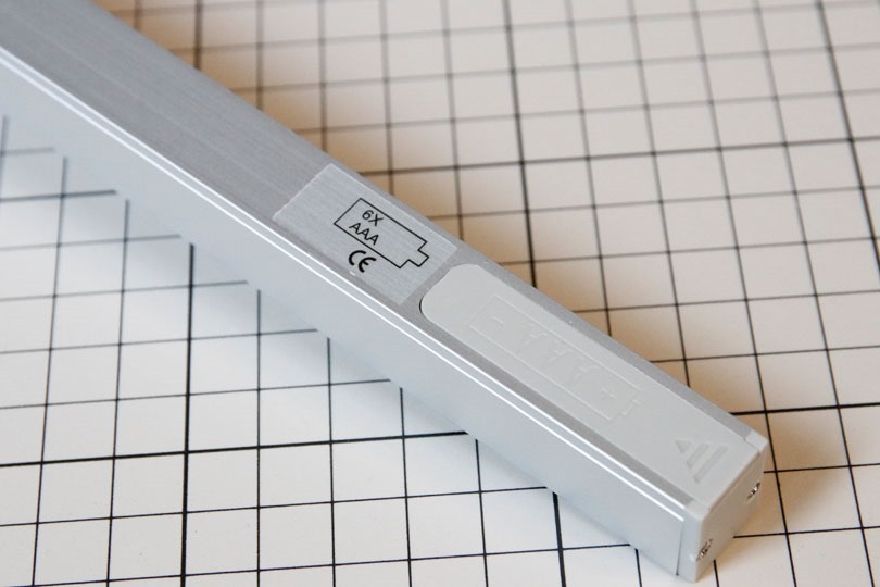 裏側に、スライド式の電池投入口があります。AAA型――つまり単4型電池を、6本必要とします。