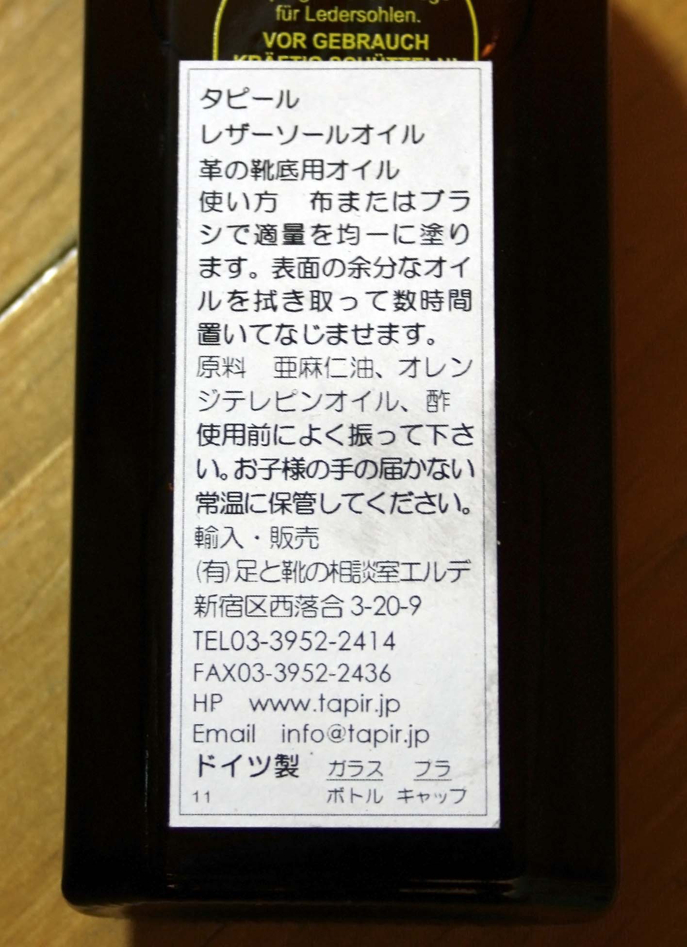 ドイツ製の靴底(底革)専用を謳った、「タピール レザーソールオイル」です。