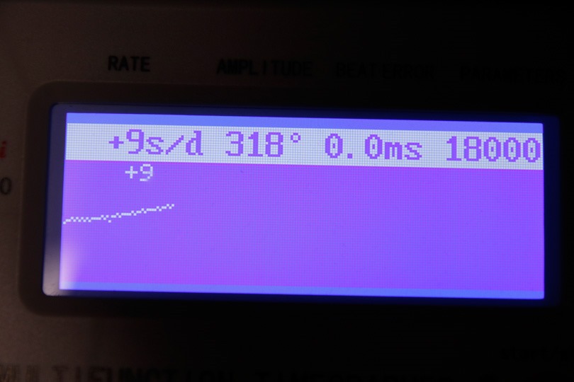 液晶画面に日差やテンプの振れ幅、振動周波数などが表示されます。画面上は日差で+9秒の表示が出ています。機械式としてはかなり良い方です。