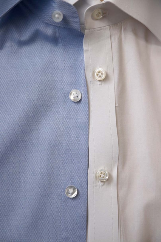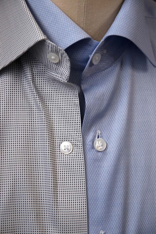 左(水色)がFirst Experience、右(白色)がイタリアのシャツブランド「ルイジ・ボレッリ」(Luigi Borrelli)のシャツです。