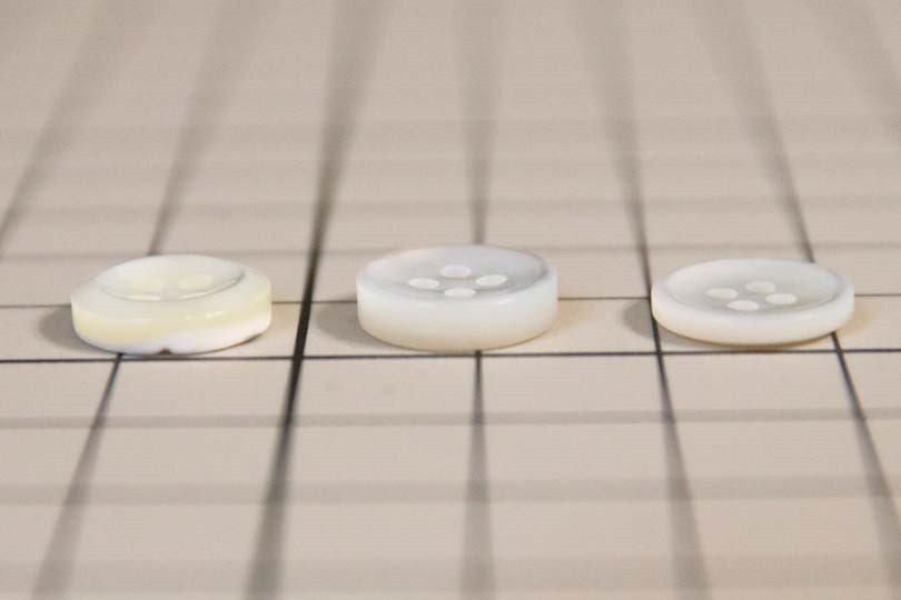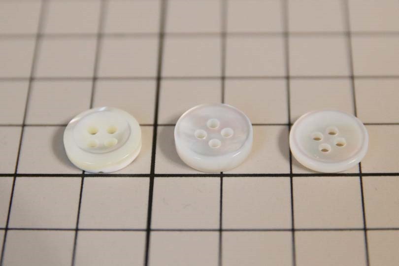 左が高瀬貝の3mm厚ボタンです。(中央と右が白蝶貝の3mmと2mmです。)