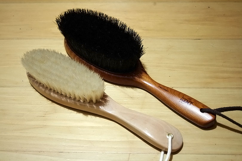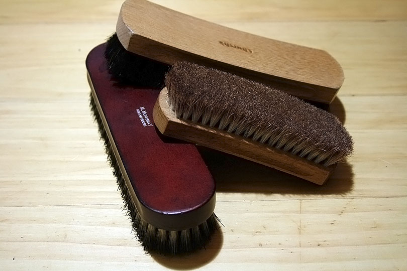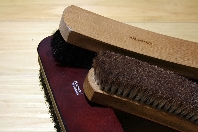 左はモゥブレイの靴ブラシ(日;コシが強い豚毛のブラシ。平野ブラシとのコラボ。靴クリームを塗るときにも使える)