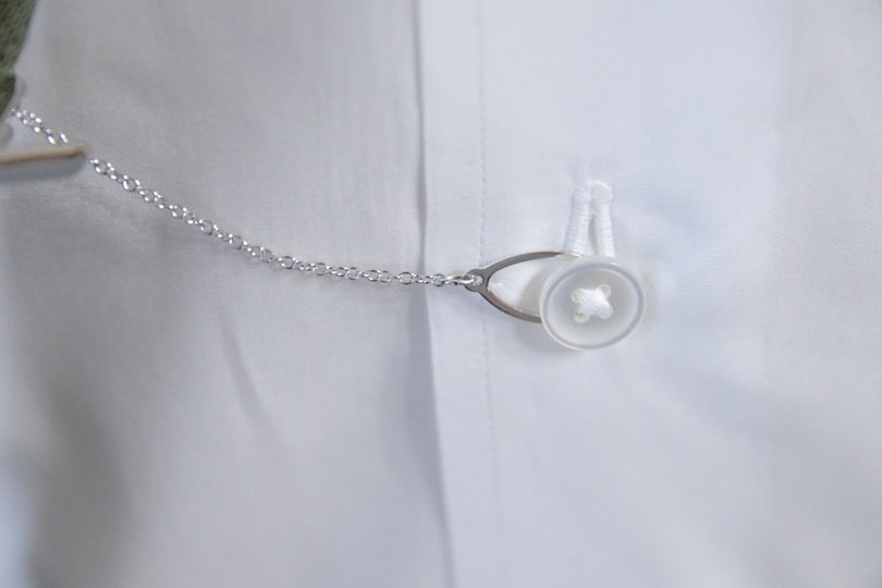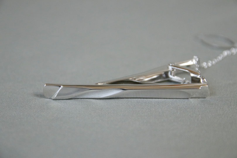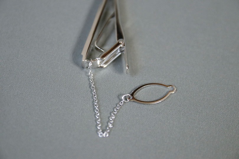 通常、クリップはネクタイの大剣と小剣、さらにシャツごと挟みます。しかし、チェーンがついているタイプの場合、クリップは大剣と小剣のみを挟むことで、「ネクタイが優雅に揺れる」のだそうです。しかし、個人的にはシャツごと挟むのが好みのため、正直このチェーンは不要に感じています。