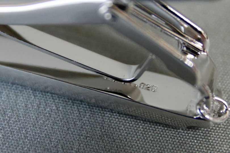 銀無垢(シルバー925;スターリングシルバー)の刻印。ロジウムコーティングされているため、銀独特の輝きはありませんが、ステンレス製よりも気分的に高揚感があります^^;