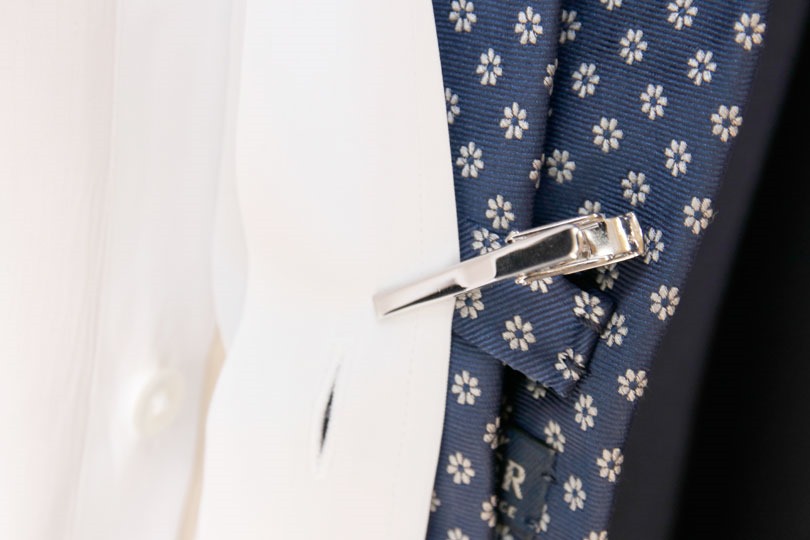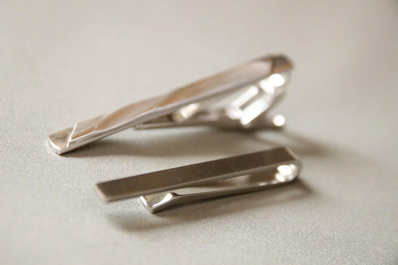 クリップを選ぶのは、ネクタイを傷つけないためです。慣れないうちは、ネクタイピンを留める場所が定まらないでしょうから、擦れて傷つけやすいタイバーより、タイクリップがオススメです。