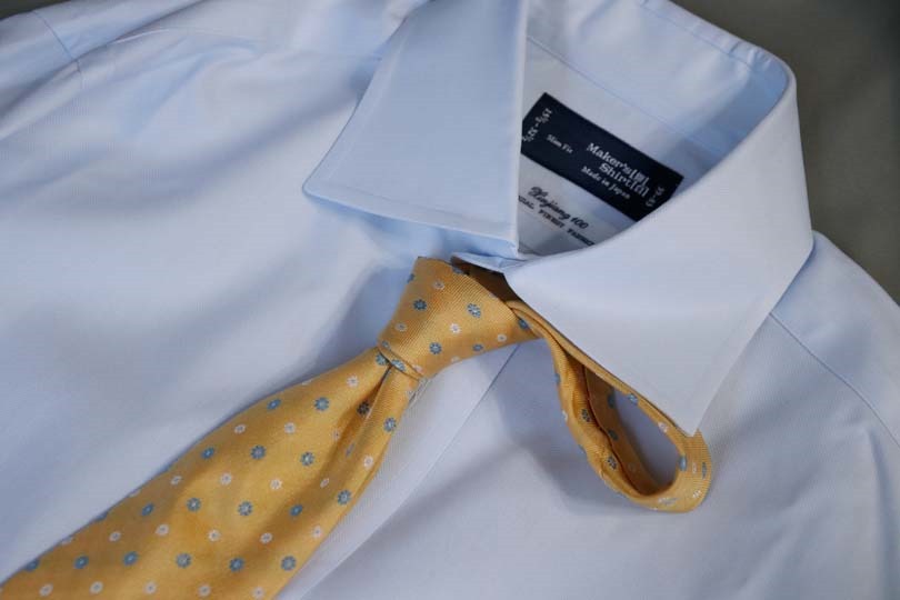 写真は、水色と白色の花があしらわれた、黄色の花小紋タイです。シャツを花の色(水色)と合わせ、色を拾うようにしています。