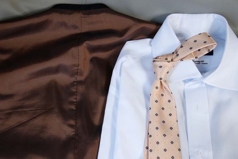 この茶色と似た裏地を持ったスーツを合わせてみます。とはいえ、ジャケットの裏地はなかなか見えませんから、三つ揃いのウェストコート(ベスト、ジレ)の背中と合わせています。