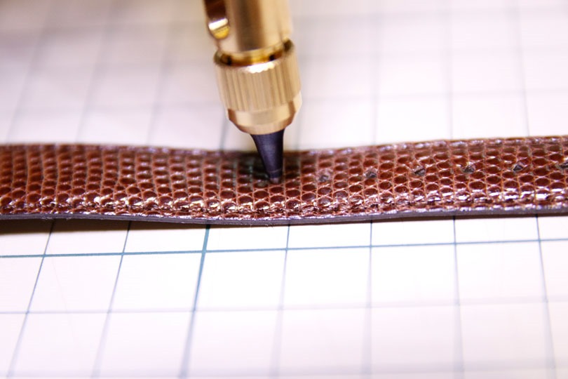 ブレずにスムーズに回転する本体軸と、切れ味の鋭い替え刃が、今回の様な薄く引きつりやすい爬虫類革も、はたまた厚いステアハイドのズボン用ベルトも、スルスルと穴を開けてくれます。
