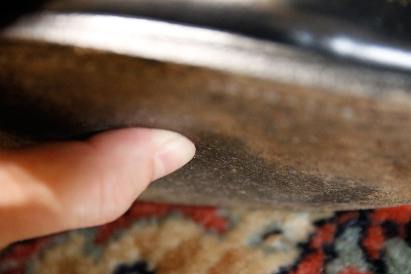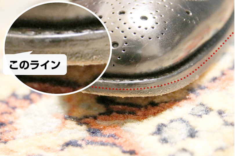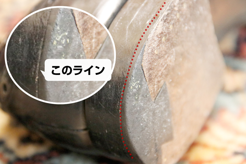 目安は写真の赤点線部分のところまで。もう少しでここにかかりそう、という時には修理に出します。(この写真は結構限界です。)