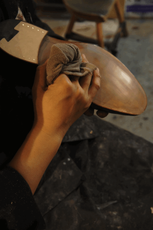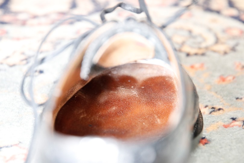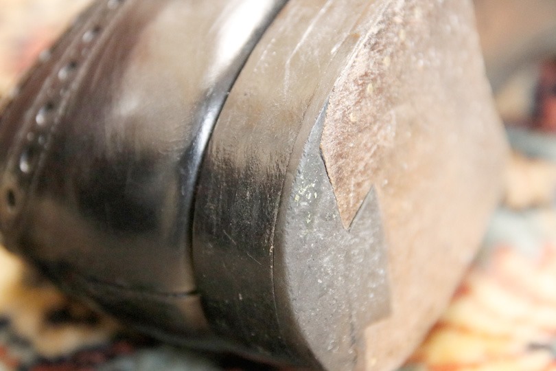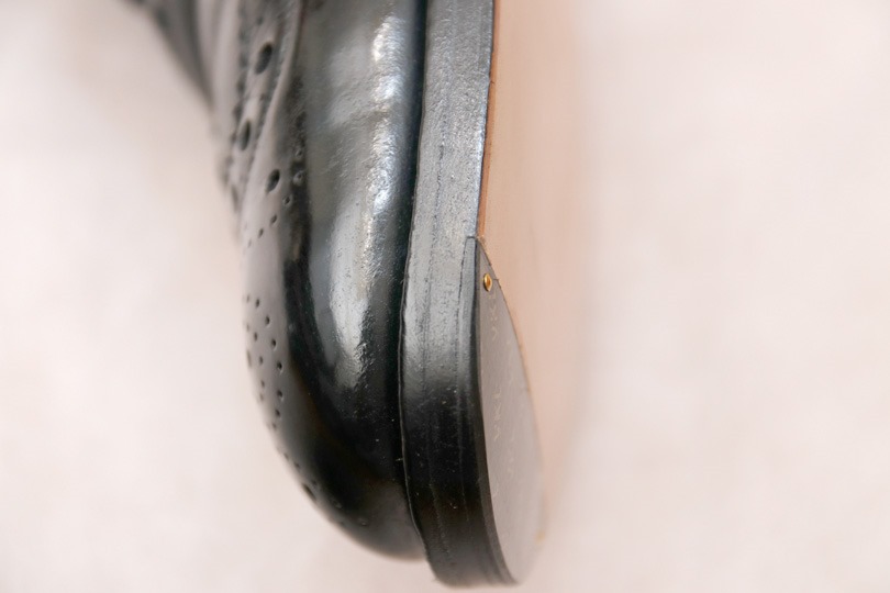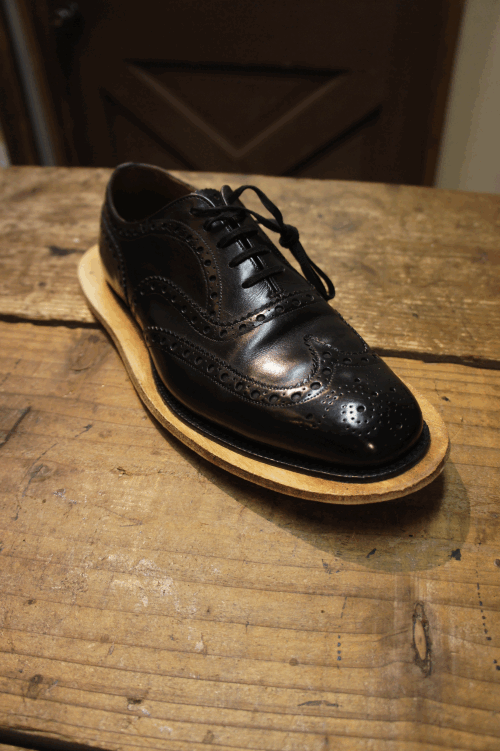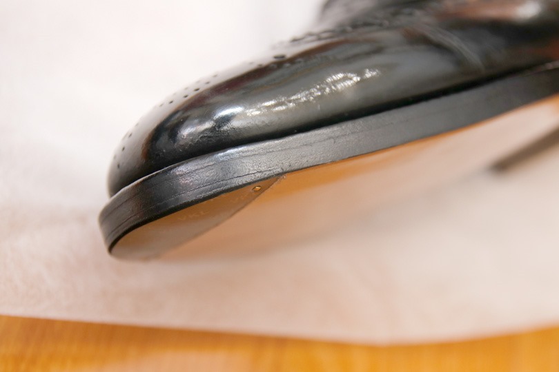つま先の部分が若干上がっているのが分かります。これは、平らな革を事前に湾曲させ、つま先が削れるのを防いでいるそう。