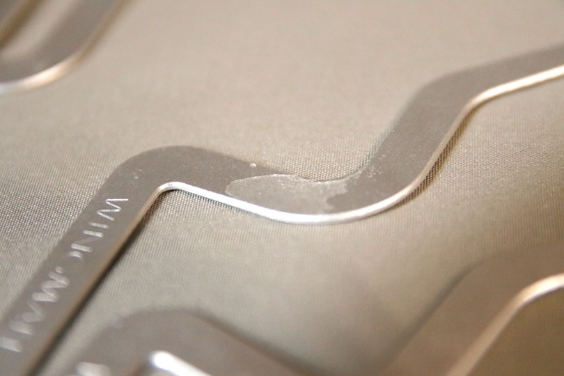 曲げた際に折れないようにするためか、少し厚手です。従って、薄手の生地を使ったシャツの場合、すこしWINGMANが浮き出て見えてしまうかも知れません。