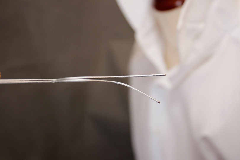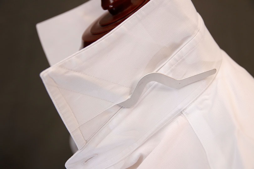 まず、シャツのカラーステイ(カラーキーパー)を入れる部分に、とがった方を挿入します。