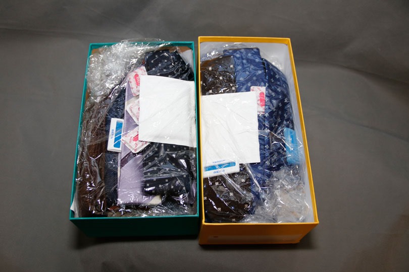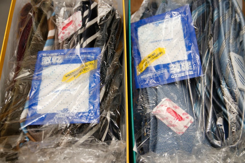 こんな感じで秋冬物のタイが収納されています。防虫剤と、除湿剤を入れ、ビニールで密閉しています。