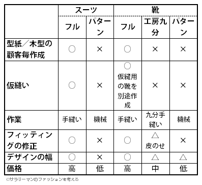 この表を見た限りでは、スーツと靴のフルオーダーは、似た様な作り方に見えます。