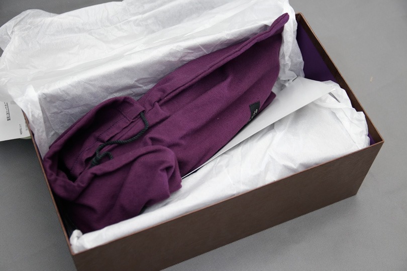 紫の布は、シューズバッグ(靴用布袋)です。特徴的な紫色は、REGAL TOKYOのイメージカラーとのこと。