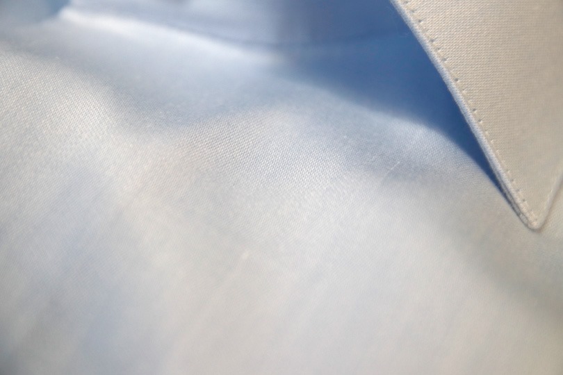 このレベルの生地と比較しても、光沢感は精紡交撚の方が上です。(やはり比較すべきは単糸のヌメッとした生地なのでしょうが、生憎適当なシャツが手元に無く……。)