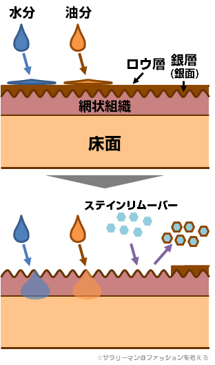 しかし、先述のような堅くこべりついた古い靴墨は、専用のリムーバー(モゥブレイのステインリムーバーが有名。過去のレビュー記事)を使うことで、よく落とすことができます(下図参照)。