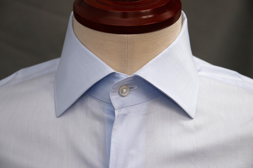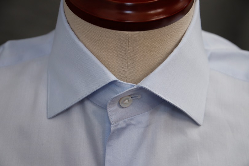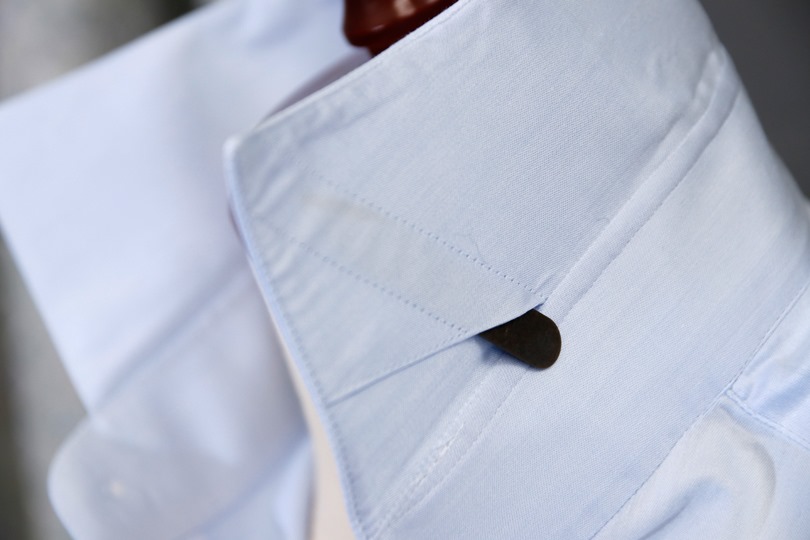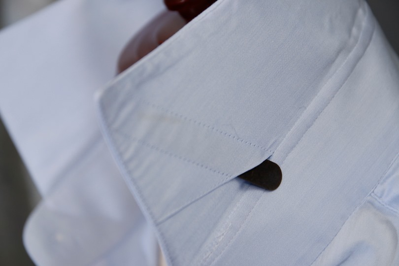 このシャツは、プラスチック製のカラーステイが左右の襟に入っている状況です。襟羽根が綺麗なアーチを描いています。