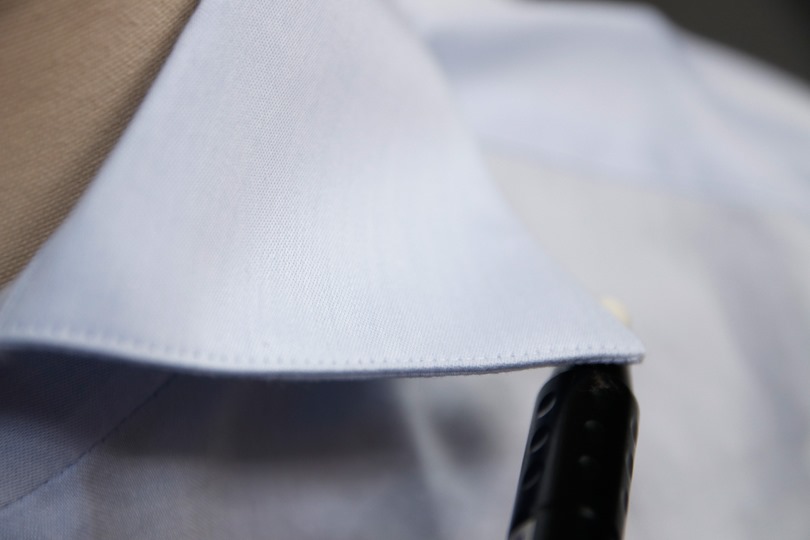 これはカラーステイを入れた状態の襟です。下から持ち上げたときにカラーステイが抵抗してくれるため、容易には曲がりません。