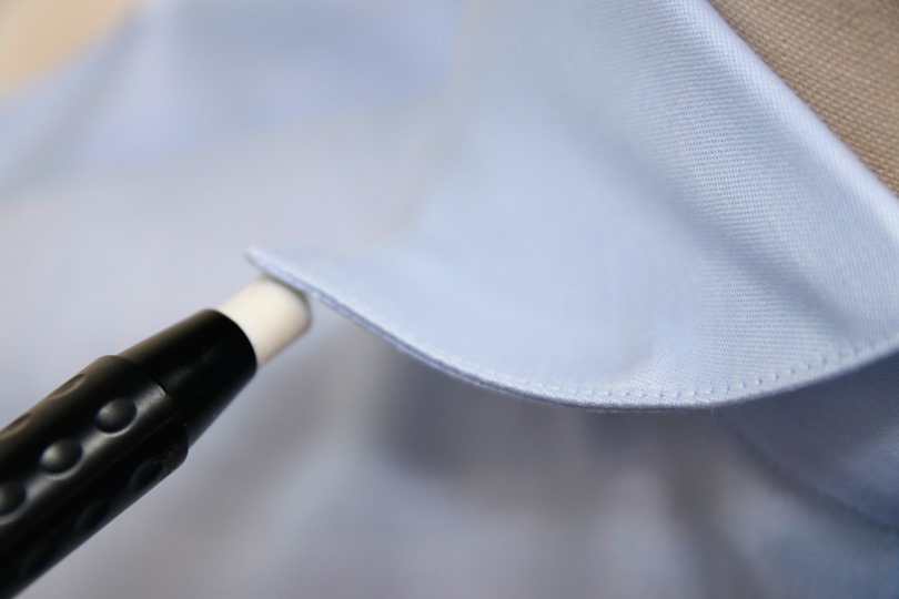 洗濯後、シャツの襟を伸ばしたまま乾燥させるためにカラーステイを入れたくなります。しかし、カラーステイを入れた襟を上からプレスすると、カラーステイの形が襟に浮き出てしまいますし、やはり傷みます。