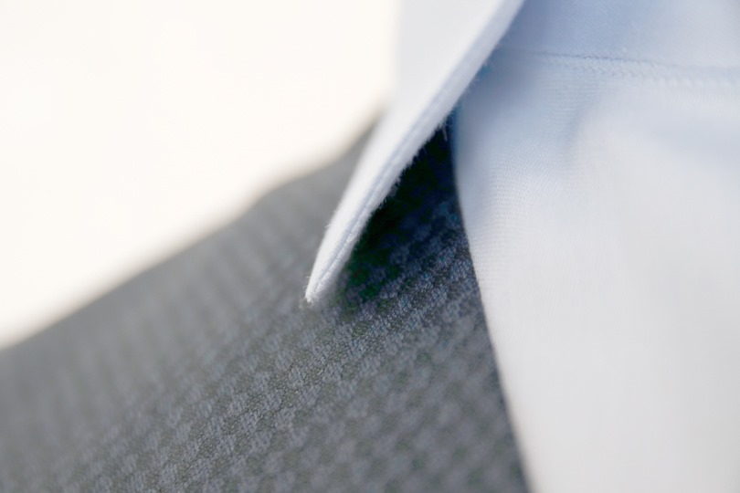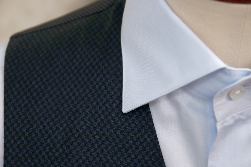 カラーステイを取り除くと、当然シャツ襟は柔らかくなります。柔らかくなると、襟が浮きやすくなり、スーツの下襟(ラペル)やウェストコートに干渉しやすくなります。実際に見てみましょう。
